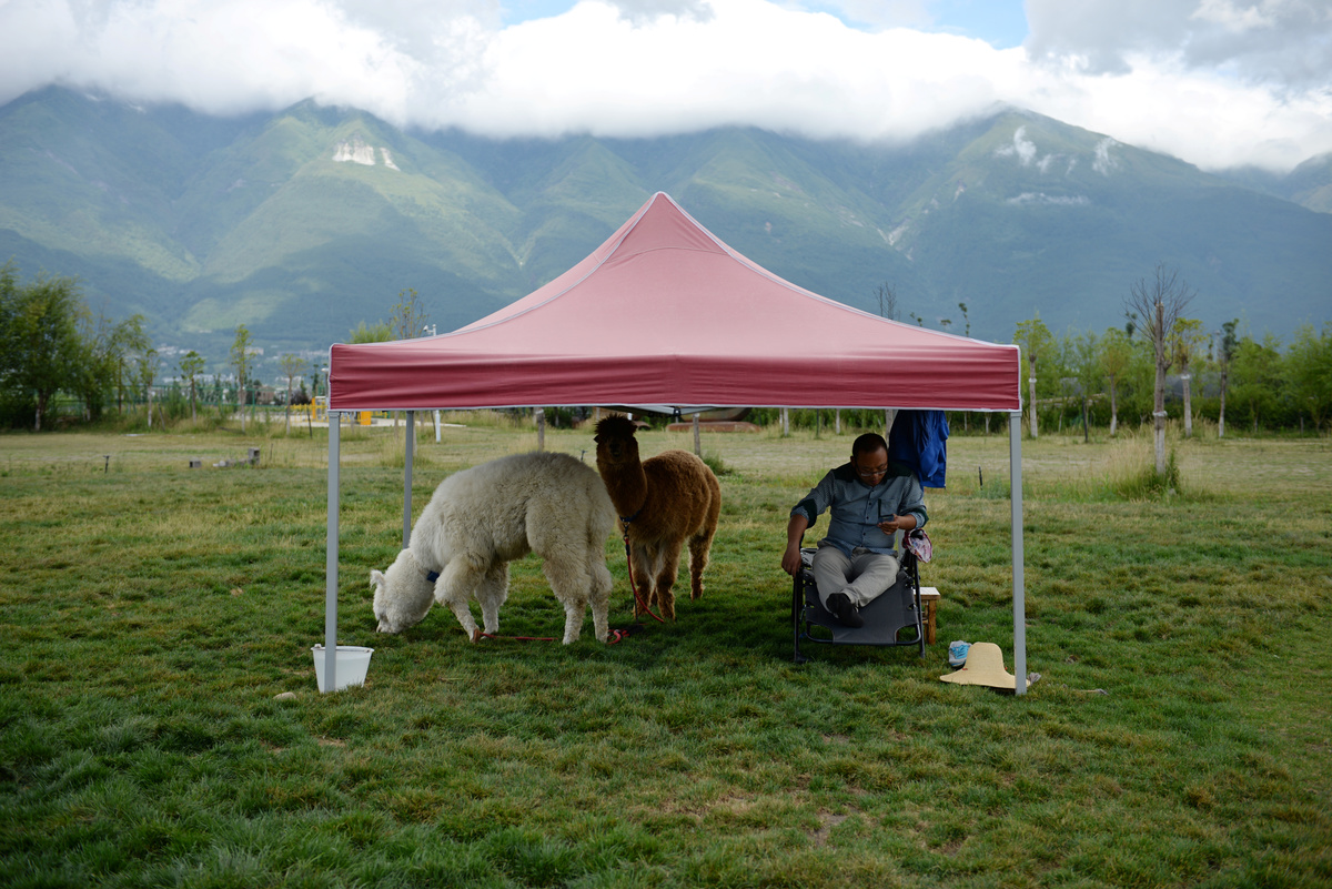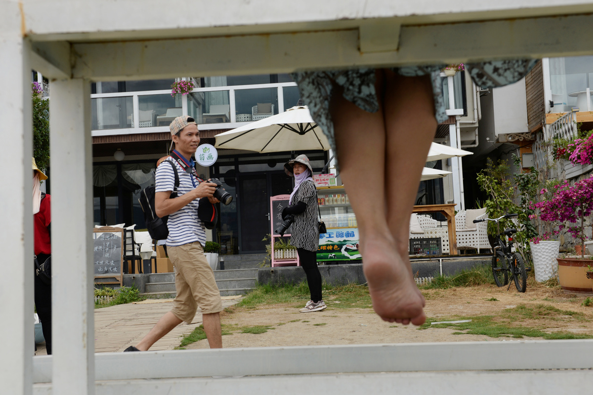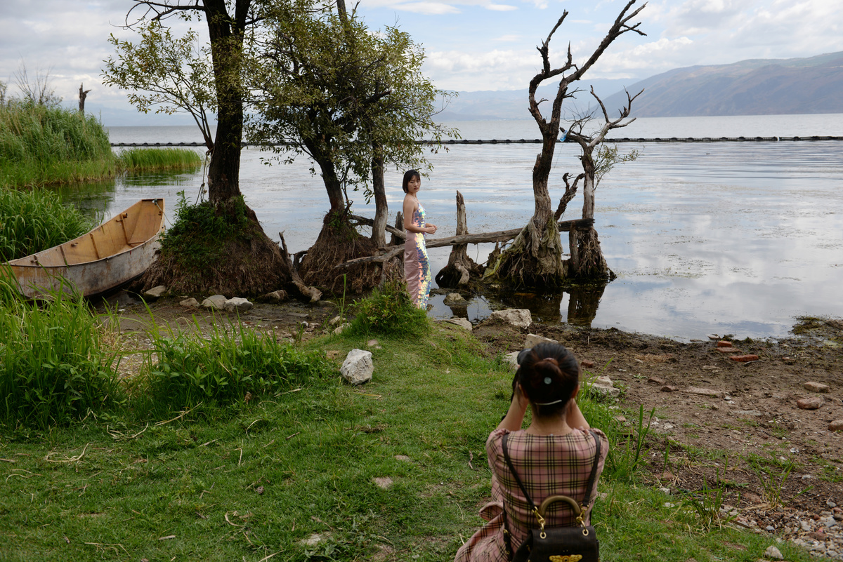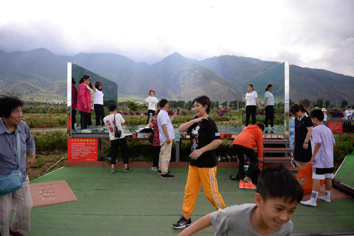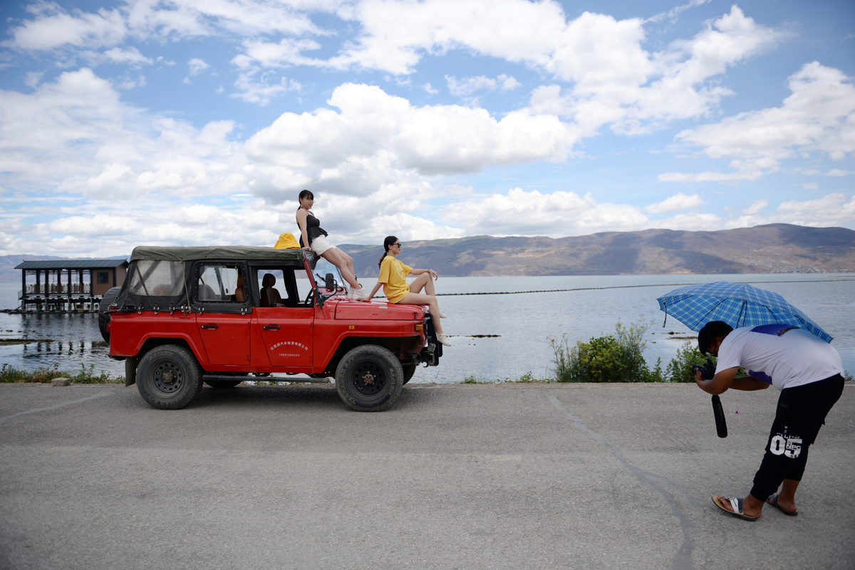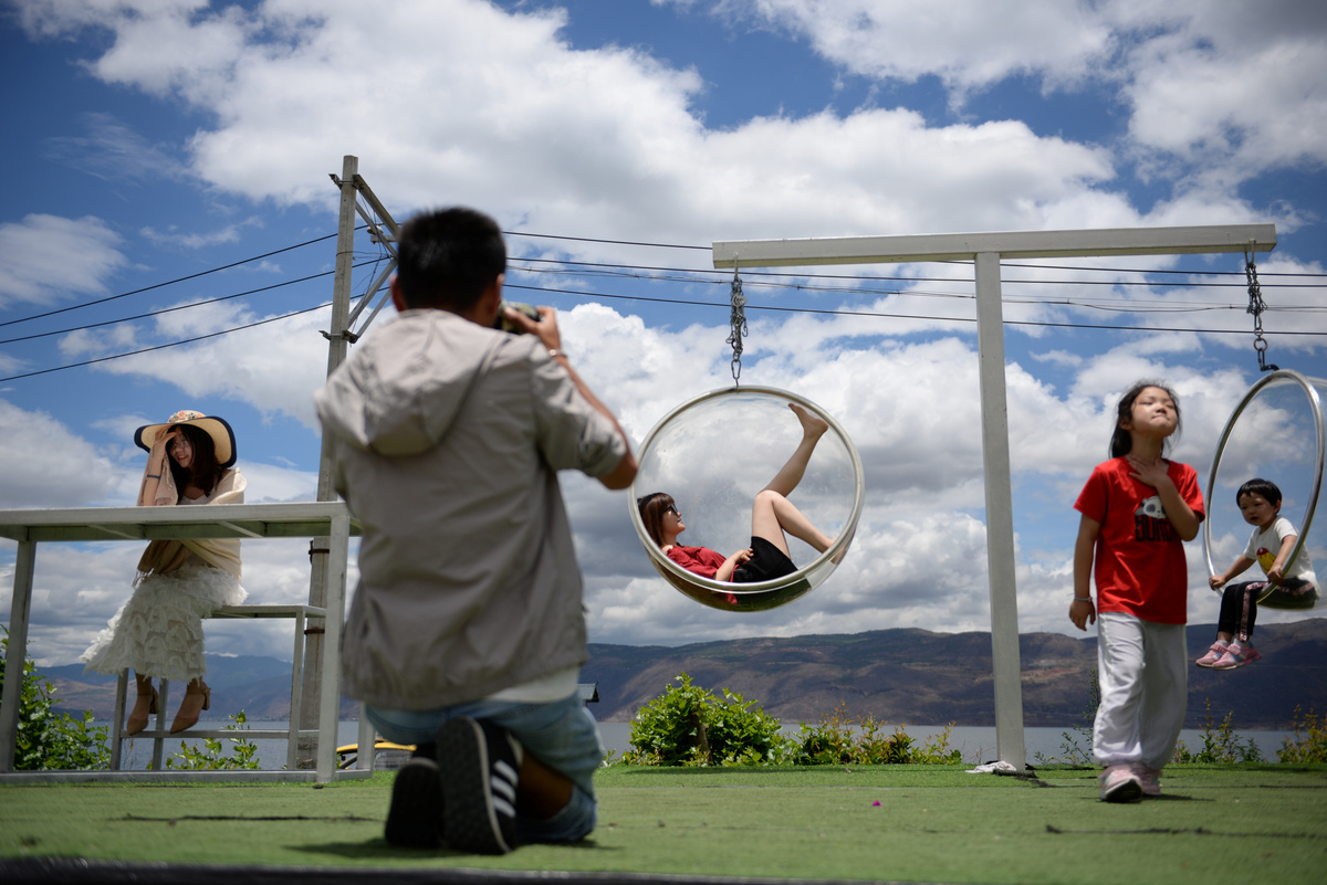 Visitors to Erhai lake say photography sets offering everything from rare animals to fields of brightly-colored flowers are essential to creating their Kodak moment.
