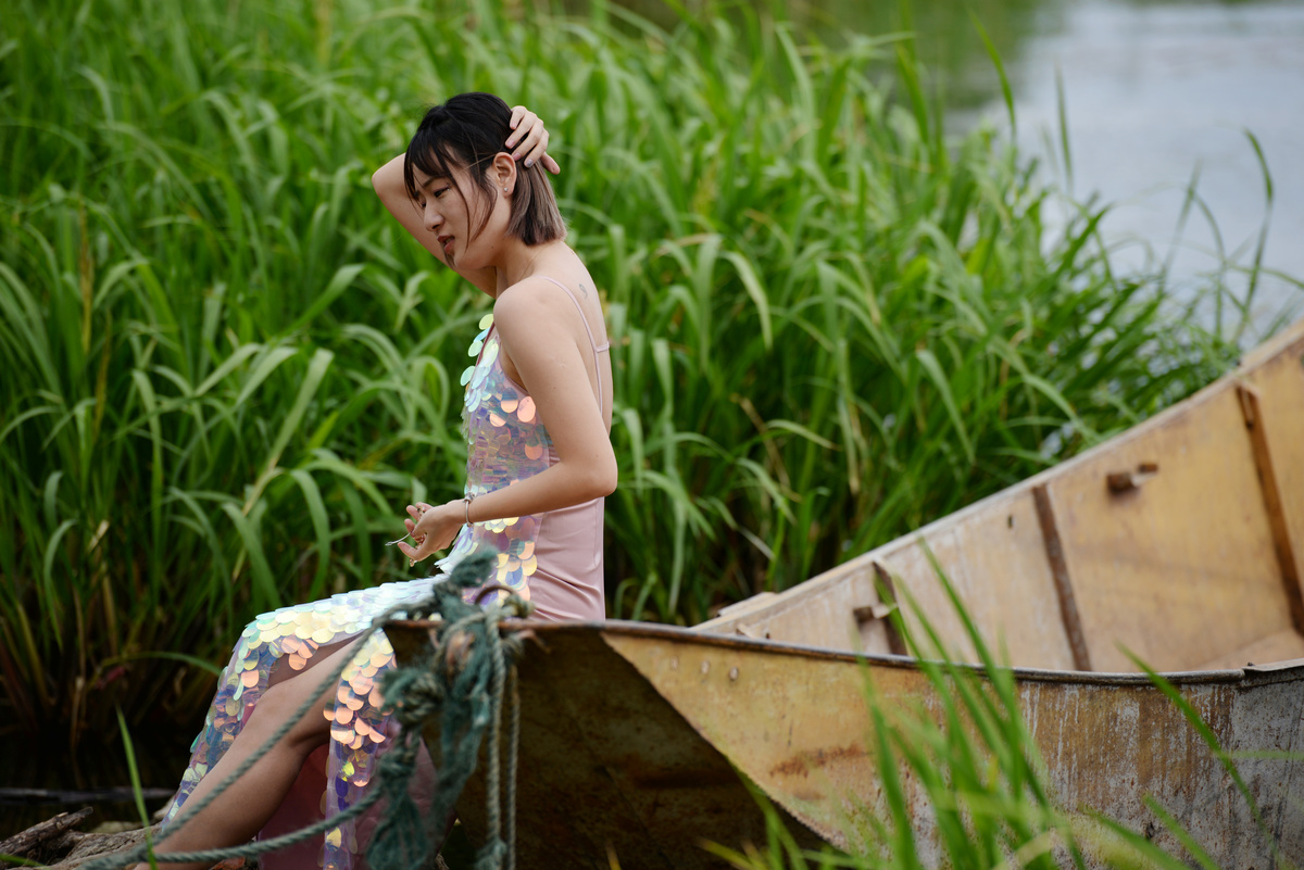 Yan Mengjie, a tourist from Shanghai, wore a sequined dress with a mermaid tail as she struck a pose in a bubble chair. She was surprised by the half-demolished buildings nearby.