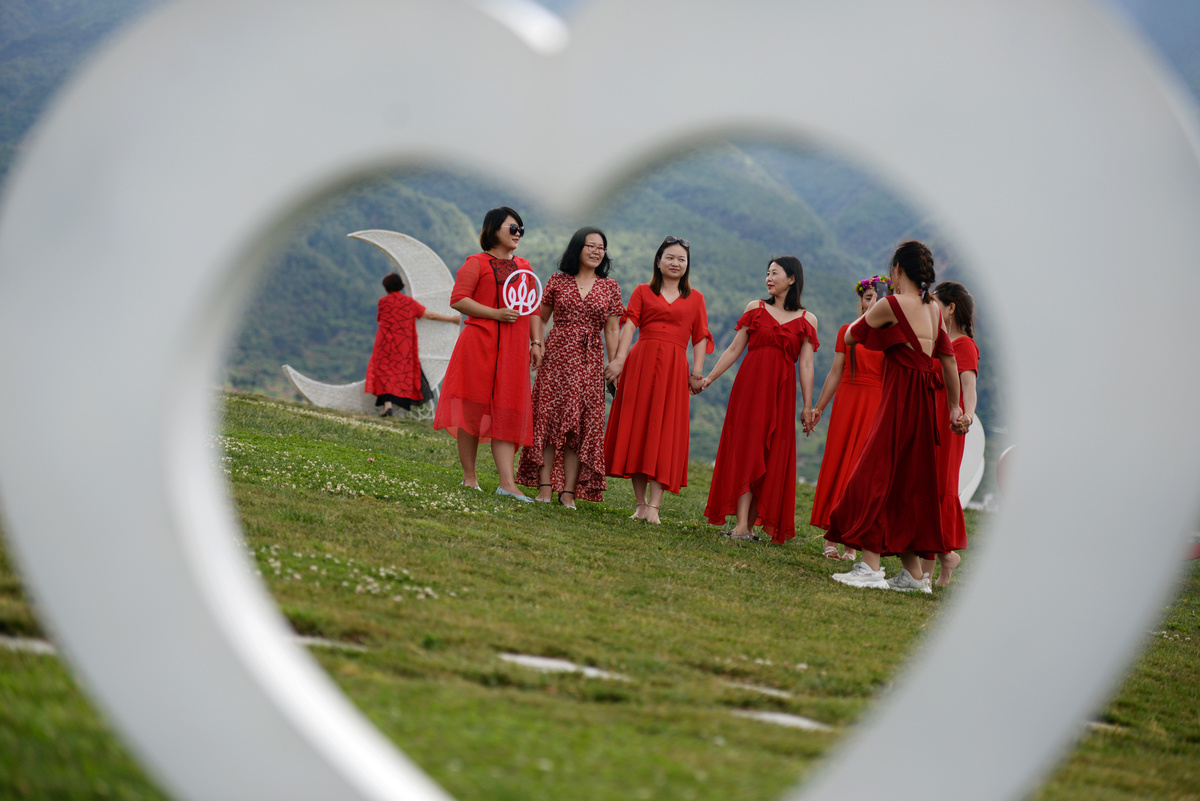 Women posing for pictures are seen through a heart-shaped prop near Erhai Lake in Dali Bai Autonomous Prefecture, Yunnan province, China June 15, 2019. Picture taken June 15, 2019. REUTERS/Tingshu Wang