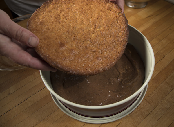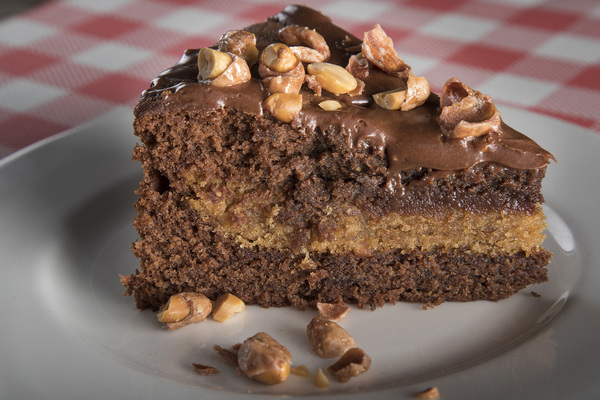 Once baked and freed of the springform pan, the cake holds no clue that a pie lurks within. Finished with a glossy blanket of ganache and a ring of chopped peanuts, the resulting dessert is a looker.