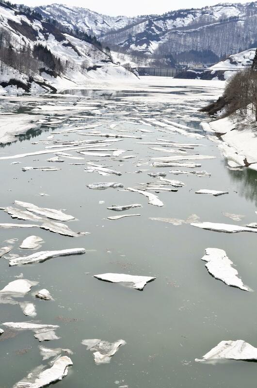 It has come a little earlier than usual this year, but now is the season to view a phenomenon in which chunks of snow float on the surface of the reservoir of the Aburumagawa Dam in Uonuma, Niigata Prefecture. The area that gets heavy snowfall of more than 4 meters every year, leading to this typical early spring scene at the reservoir. Melting snow causes the water level to rise, causing large amounts of snow on the shore or surface to start floating.