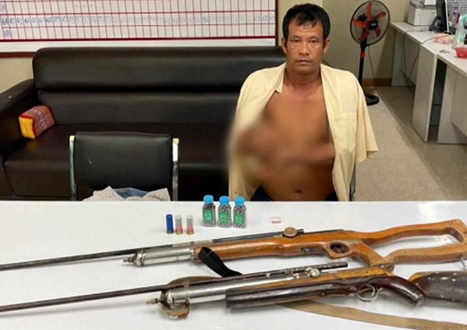 Tha Bo police on July 23 nabbed Banpot Phongam, 45, after he took an air rifle to a neighbour's place behind Wat Sawang Thammawat and threatened his wife.
