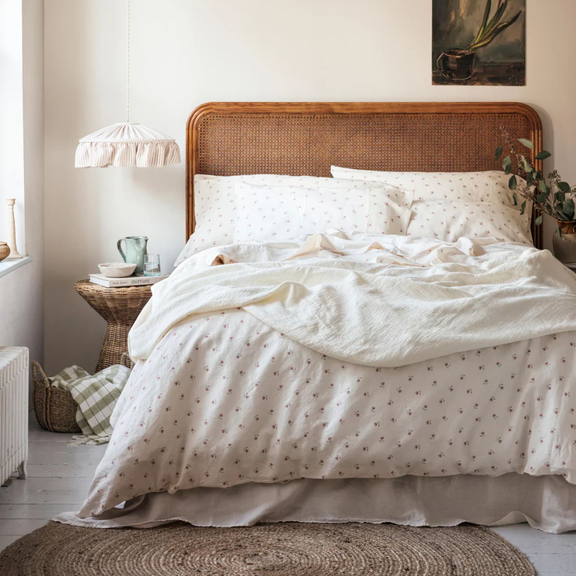 This Pearl Posy Bud bedding is woven from 55 per cent European linen and 45 per cent long staple cotton, for a natural breathability that will keep you cozy in winter and cool in summer. It also features inside corner ties to stop your duvet from slipping.