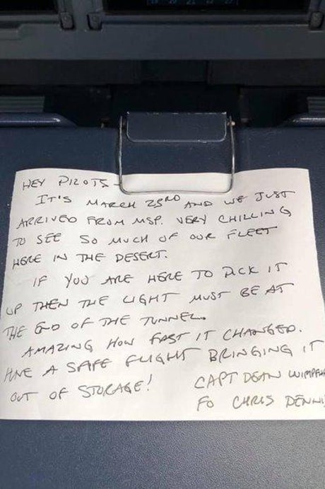 “Hey pilots,” the handwritten note began. “It’s March 23rd and we just arrived from MSP [Minneapolis–Saint Paul International Airport]. Very chilling to see so much of our fleet here in the desert.