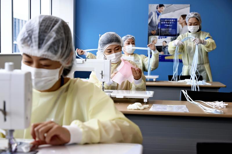 At the All Nippon Airways training center, near Haneda airport, Ota Ward, Tokyo, about 30 people clad in medical gowns to protect themselves against infection, were cutting fabric and making strings for medical gowns with sewing machines. The pilots and flight attendants were working on unfamiliar tasks.