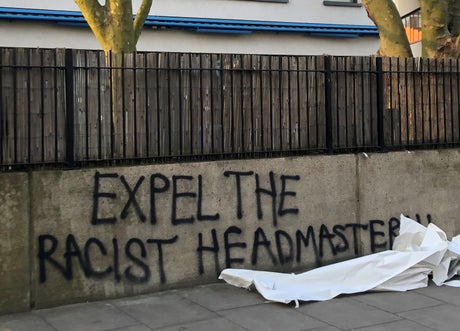 The graffiti, which reads: “They want to expel the students for speaking out” and “Expel the racist headteacher”, appeared on Monday morning and has since been covered over by the school.
