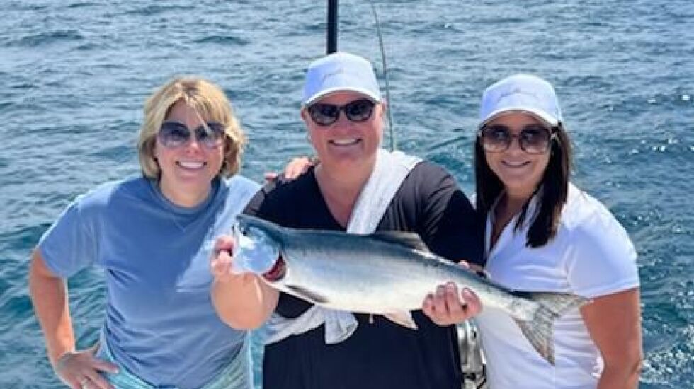 Reed caught his humpbacked pink in September at a North Side harbor. Males develop a hump in their backs before spawning, hence “humpbacks.” He completed a one-of-a-kind feat in the same month with a Chinook and coho on the same K.O. Wobbler, chrome with a blue stripe, from shore at the same harbor.
