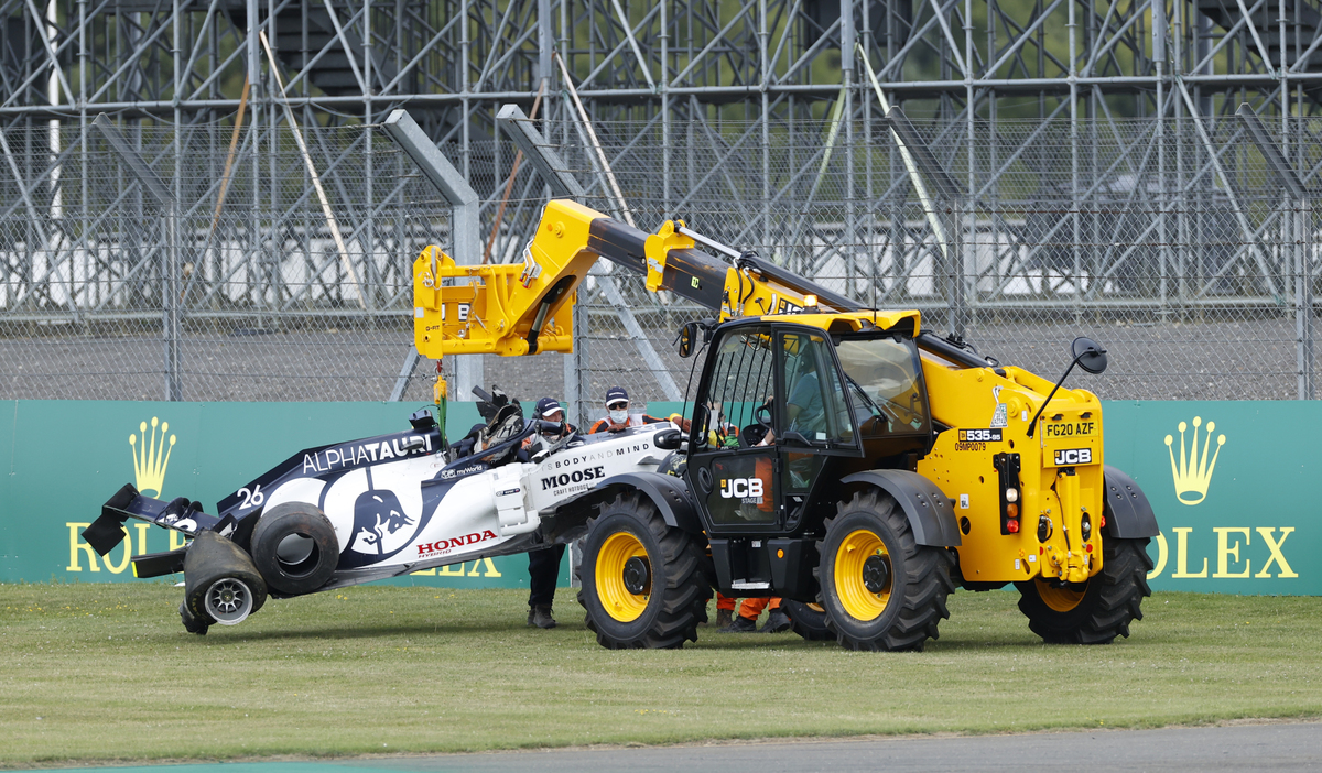 The Russian hit the wall at Silverstone on lap 12, bringing out the safety car.