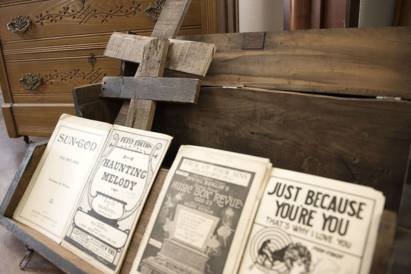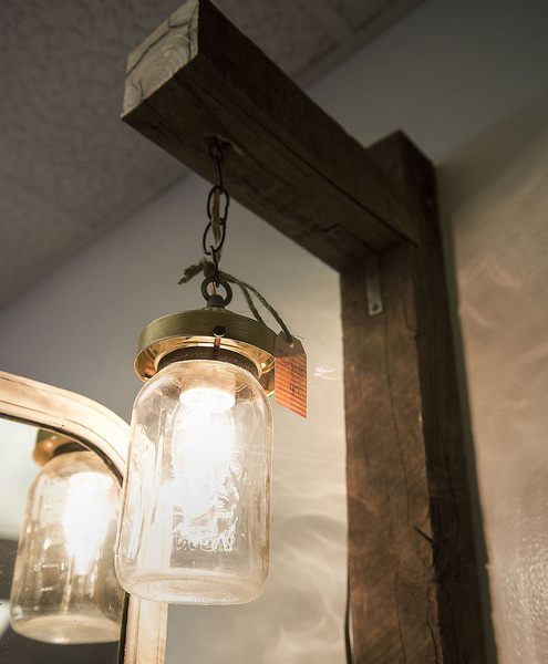 Photographer and craftsman Tim Salinetro designed and built some rustic hanging lights, and Salak's husband built crosses out of reclaimed wood to offer for sale.