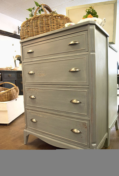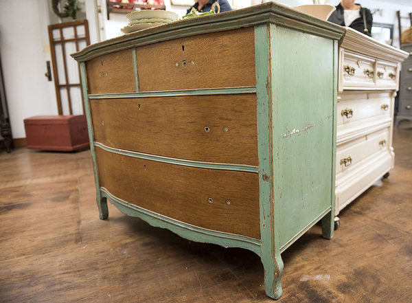 It was a $25 dresser found at a flea market that got her hooked on furniture restoration. She cut out and painted the Empire-style dresser and turned it into her kitchen sink. After taking off a coat of white paint on a recent find, she discovered another coat of old green paint that she left in place on the top and sides.