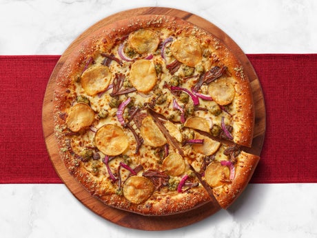 The roast dinner pizza, which represents the staycation part of the campaign, is loaded with roast beef, sage and onion stuffing, thin slices of roast potato and red onions, on a red wine gravy base.