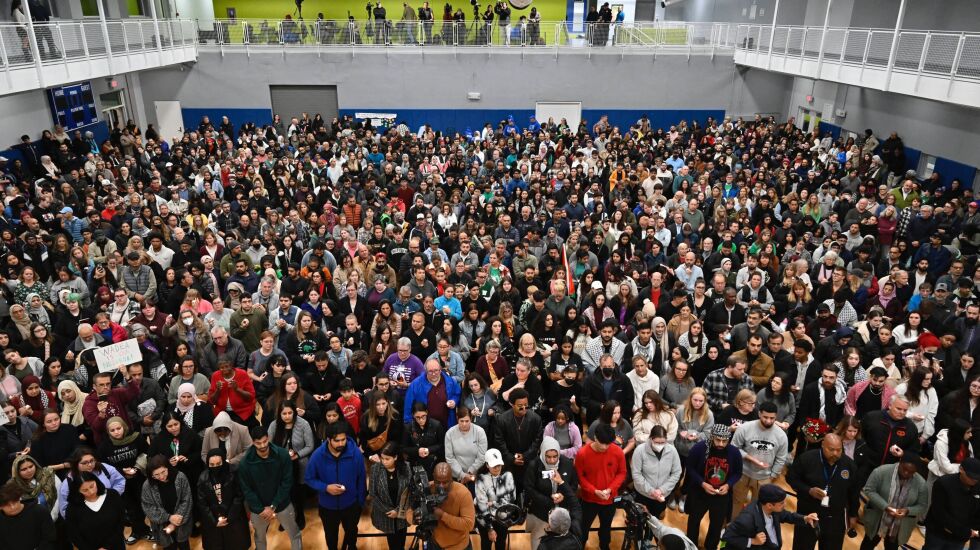 People packed the gym at Prairie Activity and Recreation Center, 24450 Renwick Road, to honor Wadea’s memory, quickly meeting the capacity of 1,400. Wadea’s father, Oday Al-Fayoume, and other members of his family sat beside a photograph of a smiling Wadea at the front of the crowd.
