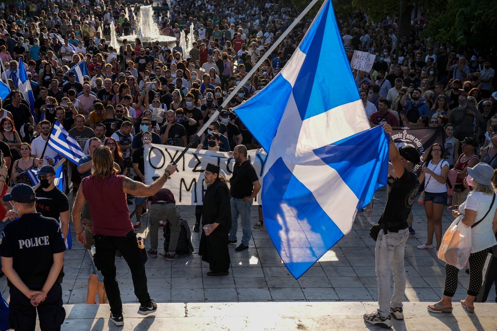In Athens, protesters chanted “Hands off our kids” and held up a banner reading, “We say no to vaccine poison.”