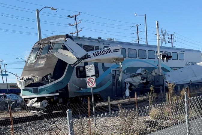 Dramatic video obtained by Reuters shows several officers freeing the man from the downed plane, which had crashed shortly after takeoff in the Pacoima neighborhood, according to local media. The officers and pilot are just a few feet away from the tracks when the passing train destroys the plane.