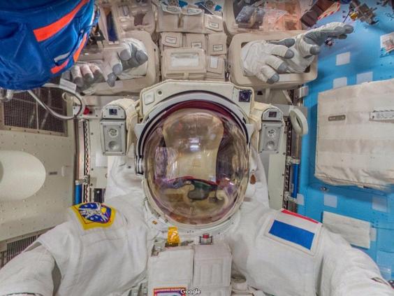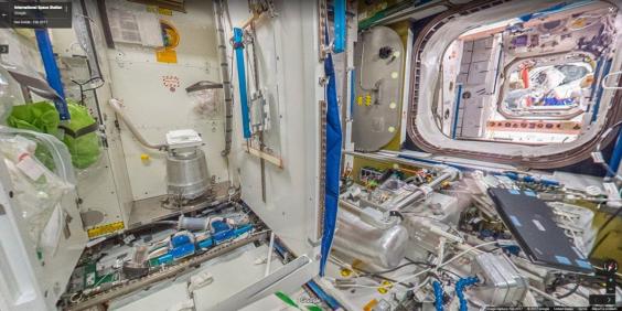 Google Maps starts you out inside the Cupola module, a multi-pane window that looks down on Earth. Make sure to spin around and click Node 3: the home of NASA's famous Waste and Hygiene Compartment (a toilet).