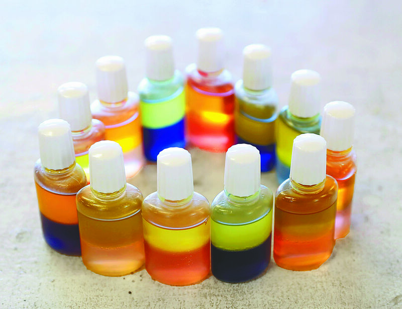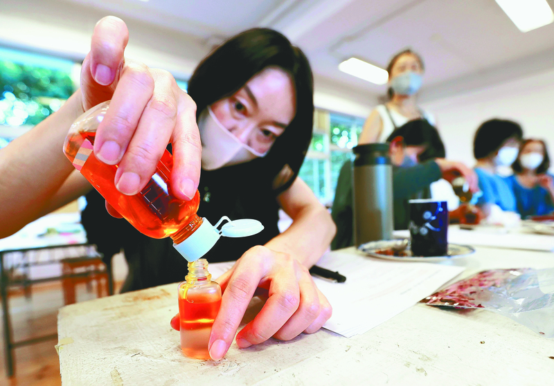 To make the skin care lotion, first, participants distill wormwood collected from the gardens to extract the fragrance. Then, they mix in orange, blue and some other colored liquids to create the desired hue. Finally, they add vegetable oil to complete the process.