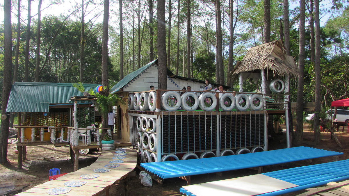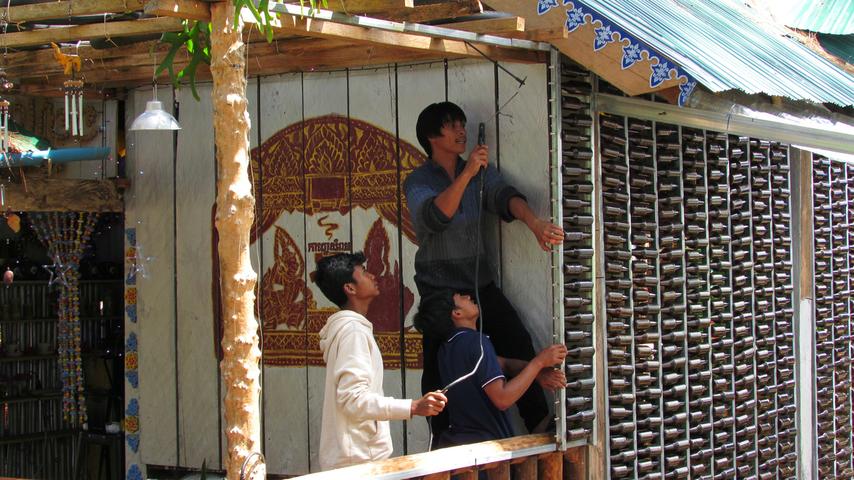 Ouk Vanday runs "Rubbish Cafe", a small wooden structure on the outskirts of Phnom Penh reinforced with walls made out of beer and plastic water bottles. The cafe spells its name with dead leaves on its signboard.