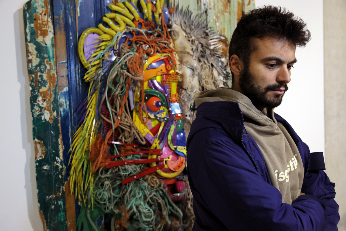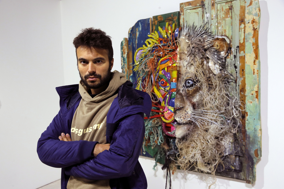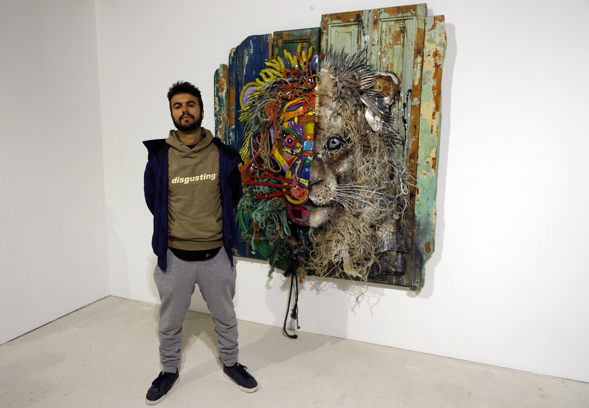 On display are brightly colored sculptures and art works depicting animals made with plastic waste Bordalo II finds in recycling centers, rubbish dumps and on the street.