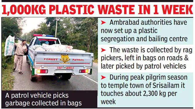 “We collect 1,000 kg of plastic every week from the roads of ATR,” said B Srinivas, field director (Project Tiger), ATR. He said that during peak pilgrim season they collect about 2,300 kg per week.