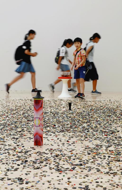 Among the other artworks infused with a playful spirit are Kazuhiro Nomura's "Altar of Laughter," where visitors toss buttons at pedestals so the scattered buttons form colorful patterns on the floor; and Japanese verbal art group Tolta's "Cube the Positive Curse," which allows visitors to freely combine building-block cubes inscribed with words to create bizarre sentences.