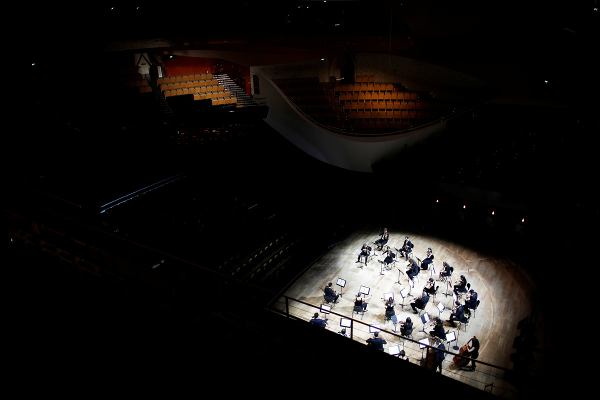 The empty Pierre Boulez hall is seen at the Philharmonie de Paris (Paris Philharmonic) as violinist Renaud Capucon and musicians perform "Metamorphosen" by Richard Strauss during a rehearsal ahead of a concert without audience in Paris, as the concert hall resumes its performances after France eased gradually its lockdown measures and restrictions following the outbreak of the coronavirus disease (COVID-19) in France, May 28, 2020. REUTERS/Benoit Tessier