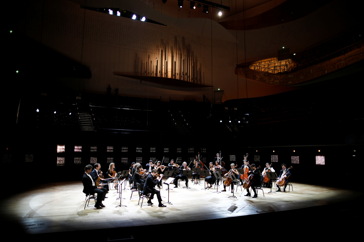 Violinist Renaud Capucon and musicians perform "Metamorphosen" by Richard Strauss during a rehearsal ahead of a concert without audience in the empty Pierre Boulez hall at the Philharmonie de Paris (Paris Philharmonic) in Paris, as the concert hall resumes its performances after France eased gradually its lockdown measures and restrictions following the outbreak of the coronavirus disease (COVID-19), in France, May 28, 2020. REUTERS/Benoit Tessier