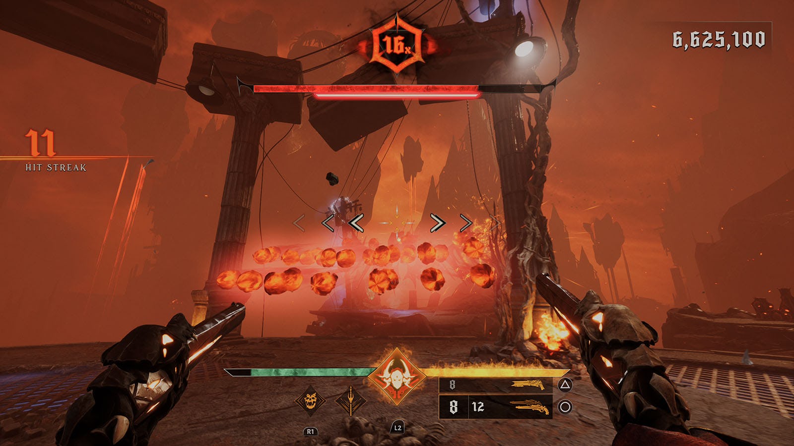 Part of what makes a good boomer shooter is the diversity of its weapons, and Metal: Hellsinger offers plenty of demon-slaying gear. Unknown will always wield the Terminus blade, Paz’s fiery cranium, and two weapons of the player’s choosing. If you’re playing the base version of Metal: Hellsinger (the one available on PS+) you’ll only have access to four weapon types. Spending money on the Dream of the Beast or Purgatory DLCs will also yield one new type each. Each weapon is good for a particular arena, whether Unknown faces wave after wave of low-ranking grunts or snipes at special commanders from across a longer distance. That said, it’s also fine to pick a weapon you like and stick with it as you perfect your demon-slaying prowess.