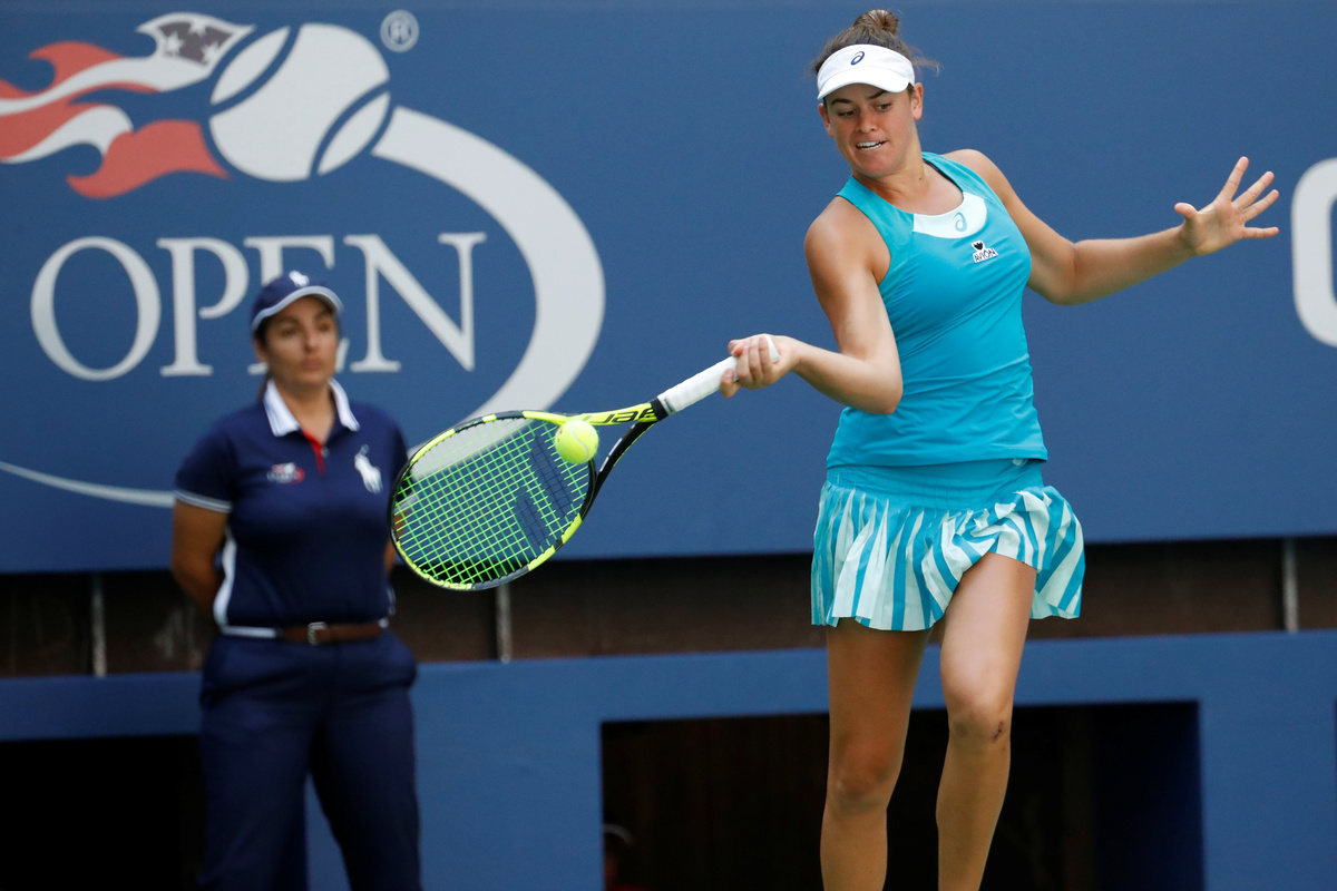 Tennis - US Open - New York, U.S. - September 4, 2017 - Jennifer Brady of the U.S. in action during her fourth round match against Karolina Pliskova of Czech Republic. REUTERS/Andrew KellyTennis - US Open - New York, U.S. - September 4, 2017 - Karolina Pliskova of Czech Republic greets opponent Jennifer Brady of the U.S. at the net after their fourth round match. REUTERS/Andrew Kelly