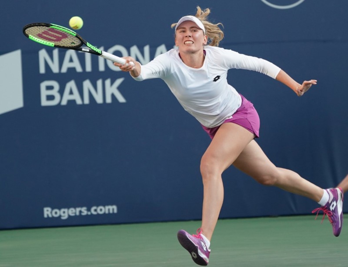 Aug 8, 2019; Toronto, Ontario, Canada; Ekaterina Alexandrova (RUS) hits a ball to Serena Williams (not pictured) during the Rogers Cup tennis tournament at Aviva Centre. Mandatory Credit: John E. Sokolowski-USA TODAY Sports
