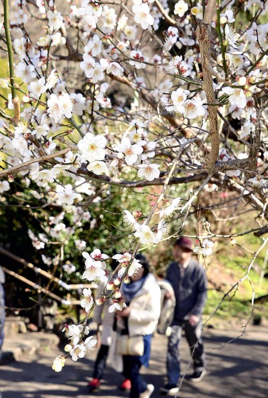 Visitors observe blossoming plum flowers Saturday at Atami Baien plum garden in Atami, Shizuoka Prefecture. The Ume Matsuri plum festival began the same day at the garden, which says its plum flowers bloom earliest in Japan. The plum festival lasts through March 3, with garden officials saying peak viewing season this year will begin in late January and end early February.