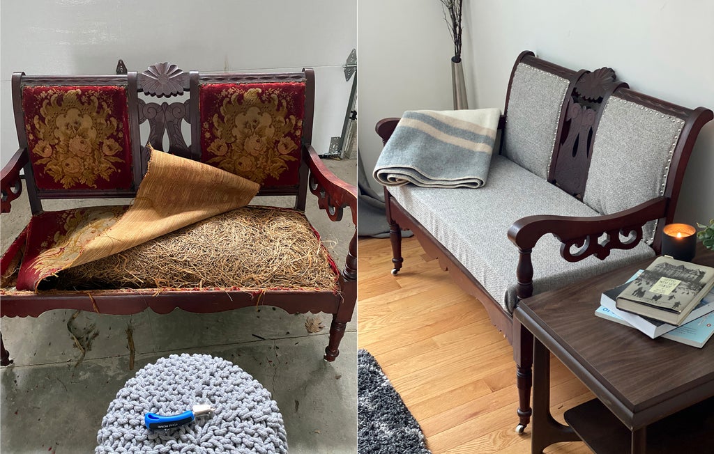 It was a challenging DIY project. The fabric was badly worn, and Hollenbach hadn’t reupholstered anything before. But he now proudly shows it to houseguests and tells the story of this cozy piece of furniture.