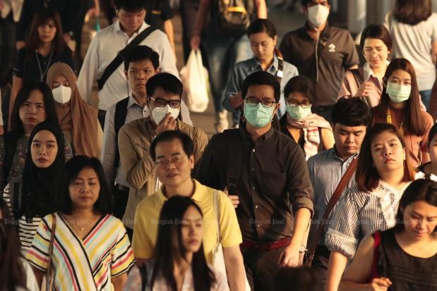Dr Sukhum Kanchanapimai, Public Health permanent secretary, yesterday urged people who worked outdoors to wear face masks and drink 6-8 glasses of water a day as PM2.5 levels rose above the so-called safe threshold of 50 microgrammes per cubic metre (µg/m³).