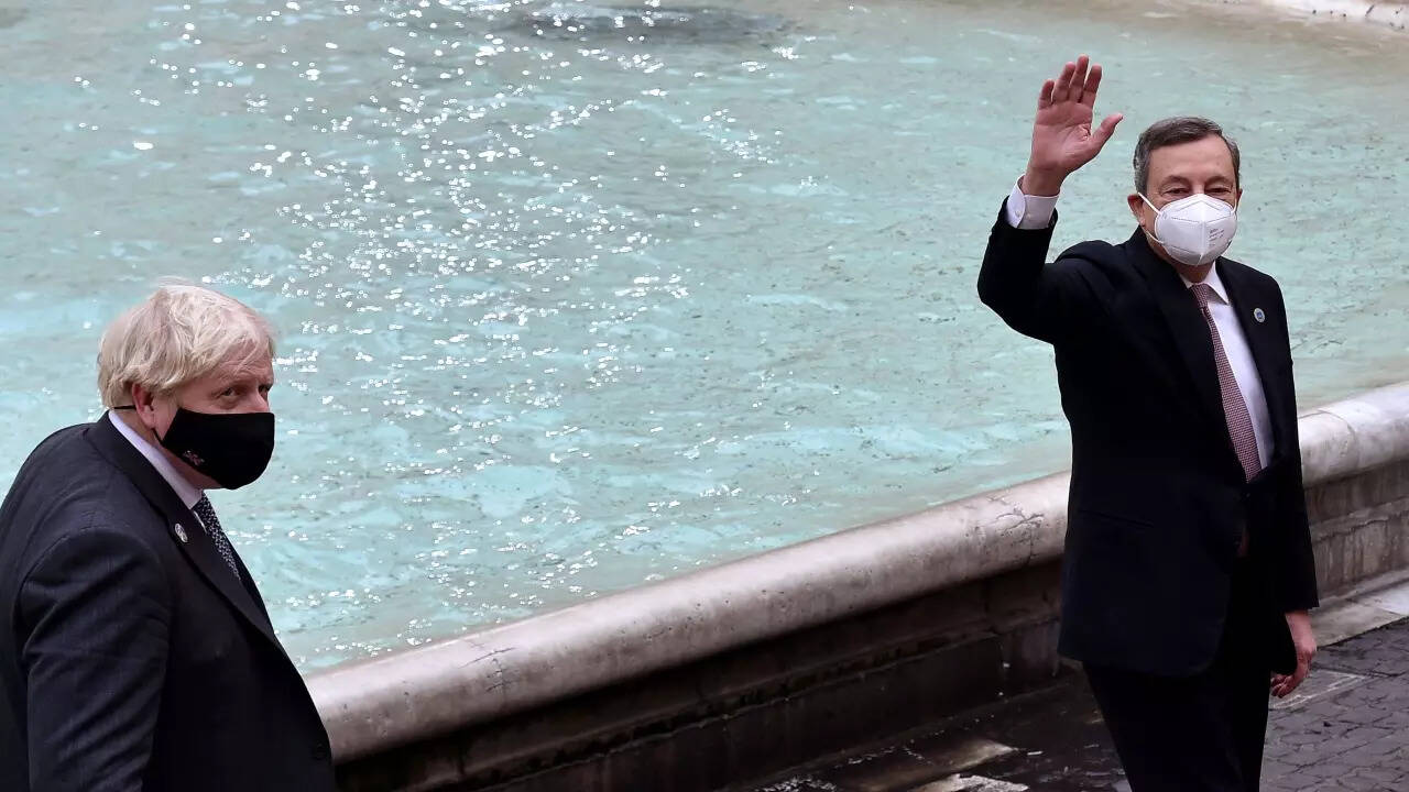 British Prime Minister Boris Johnson (L) and Italian Prime Minister Mario Draghi visit the Trevi fountain in central Rome. (AFP photo)