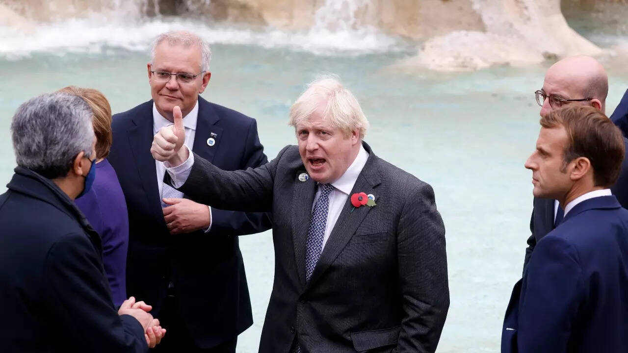 Britain\'s Prime Minister Boris Johnson gestures next to French President Emmanuel Macron and Australia\'s Prime Minister Scott Morrison in front of the Trevi Fountain during the G20 summit in Rome, Italy. (Reuters image)