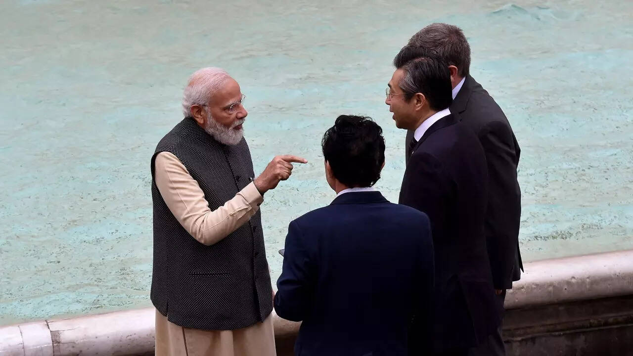 Prime Minister Narendra Modi (L) speaks with Director general, Food and Agriculture Organization (FAO), Qu Dongyu (C) and Japan\'s senior deputy foreign minister for economic affairs, Hiroshi Suzuki as they visit the Trevi fountain in central Rome. (AFP photo)