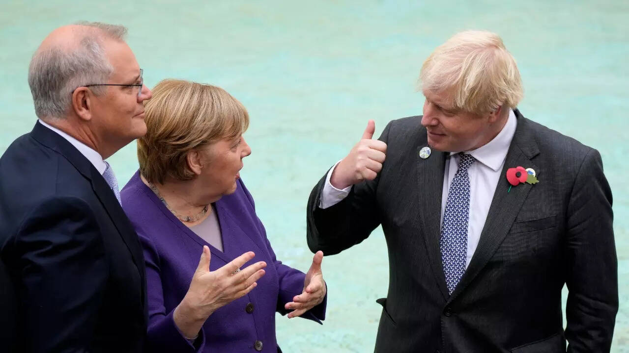German Chancellor Angela Merkel, center, speaks with Australia\'s Prime Minister Scott Morrison, left, and British Prime Minister Boris Johnson in front of the Trevi Fountain during an event for the G20 summit in Rome. (AP photo)