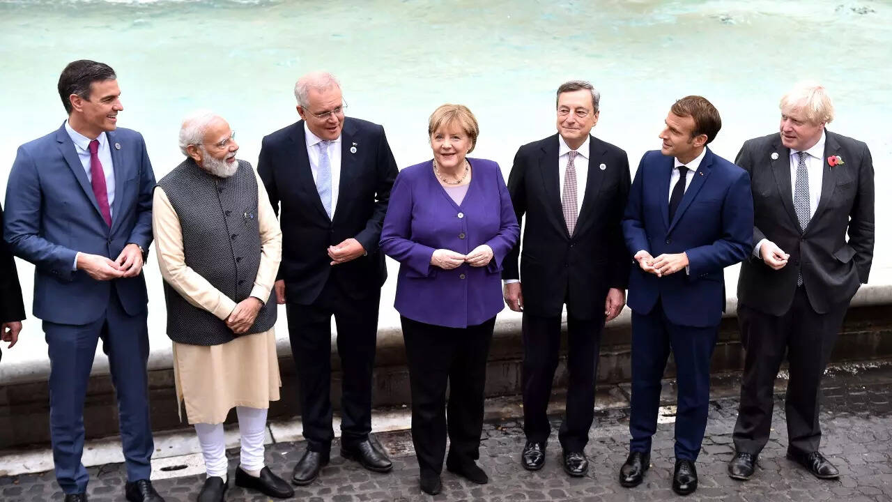 (From L) Spanish Prime Minister Pedro Sanchez, Indian Prime Minister Narendra Modi, Australian Prime Minister Scott Morrison, German Chancellor Angela Merkel, Italian Prime Minister Mario Draghi, French President Emmanuel Macron and British Prime Minister Boris Johnson visit the Trevi fountain in central Rome. (AFP photo)