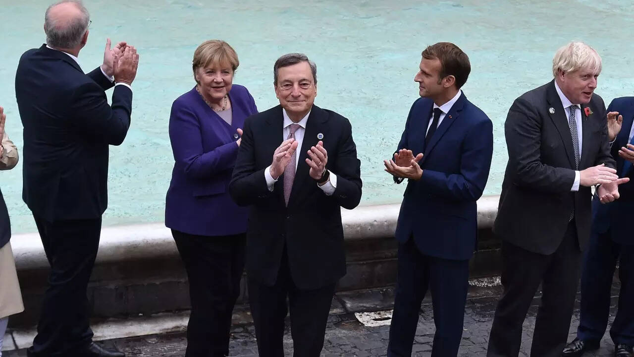 Italian Prime Minister Mario Draghi gestures next to French President Emmanuel Macron and Germany\'s acting Chancellor Angela Merkel in front of the Trevi Fountain during the G20 summit in Rome. (Reuters photo)