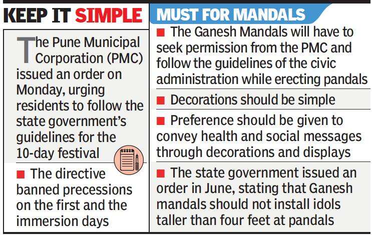 “The Ganesh Mandals will have to seek permission from the PMC and follow the rules and the guidelines of the civic administration while erecting pandals. The festival should be celebrated in a restricted manner with simple decorations. Preference should be given to convey health and social messages through decorations and displays. It should be ensured that advertisements do not attract the crowd,” the order stated.