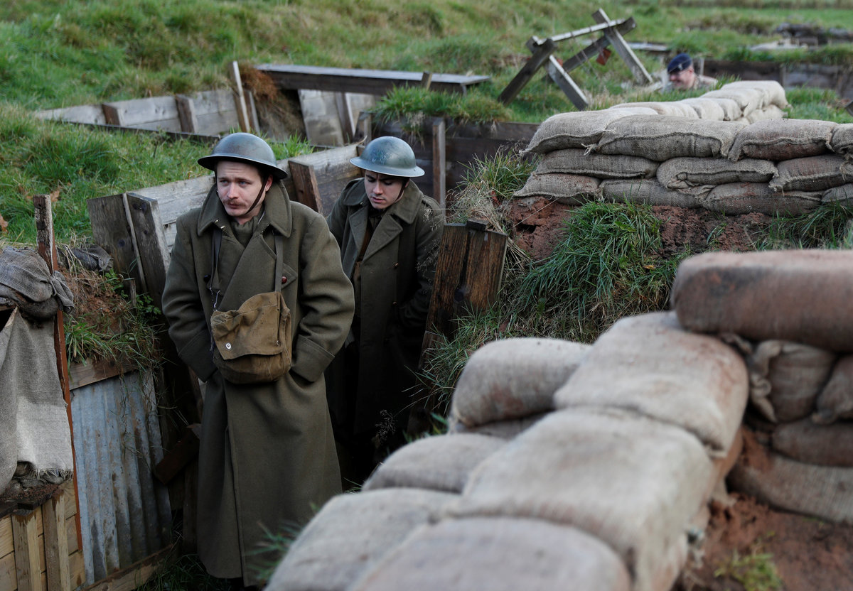 Actors Jake Morgan and Sam Ducane pose for photographs at the launch of the 1918 Poppy Pledge in a re-creation of a First World War trench at Pollock House in Glasgow, Scotland November 10, 2017. REUTERS/Russell Cheyne