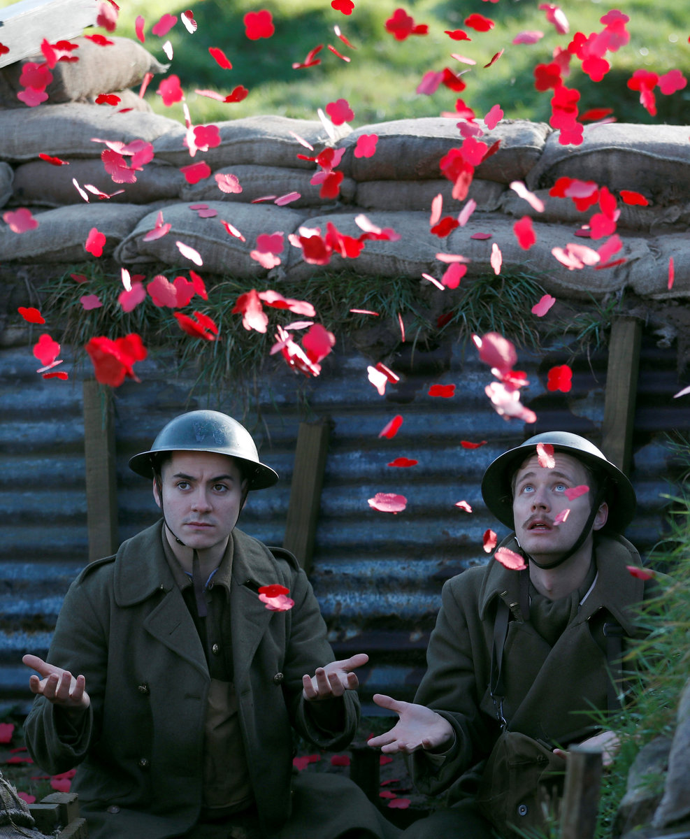 Actors Jake Morgan and Sam Ducane extend their hands to catch poppies, as they pose for photographs at the launch of the 1918 Poppy Pledge in a re-creation of a First World War trench at Pollock House in Glasgow, Scotland November 10, 2017. REUTERS/Russell Cheyne