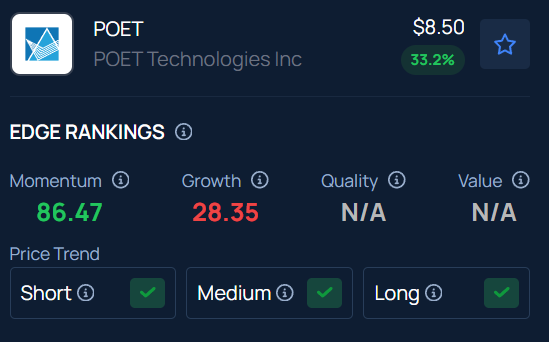 With a strong Momentum in the 86th percentile, Benzinga’s Edge Stock Rankings indicate that POET has a positive price trend across all time frames. Know how its momentum lines up with other well-known names.