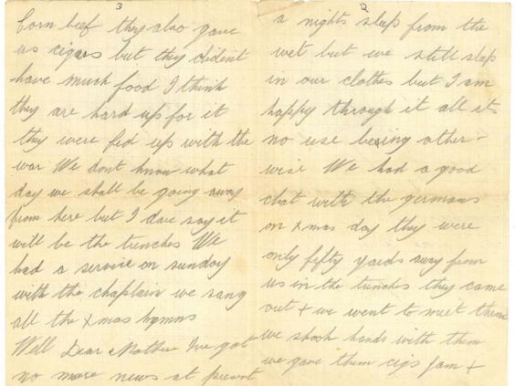 "They were only fifty yards away from us in the trenches. They came out and we went to meet them. We shook hands with them," he wrote. "They also gave us cigars but they didn’t have much food. I think they are hard up for it. They were fed up with the war."