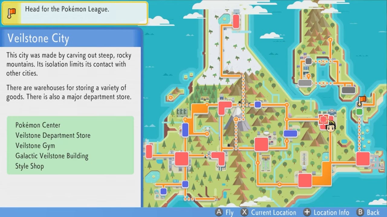 While the games’ pre-order and early purchase materials made a pretty big deal about that free Platinum Style Outfit awarded to early adopters of the remakes, unfortunately, you’ll have to be about halfway through the main campaign to access it. Rather than being an easily accessible option from an options menu, trainer customization is limited to the Metronome Style Shop located in Veilstone City. You can see the location marked on the map below. It’s the hub of the third gym players encounter in the game.