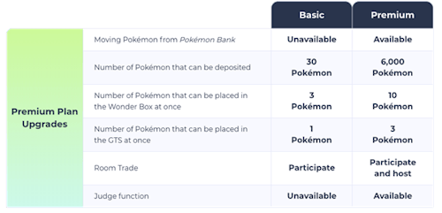 A free, basic plan is also available, but its features are vastly reduced in comparison. There's no access to the Pokémon Bank, only 30 Pokémon can be stored in the system, and you cannot host a trading room.