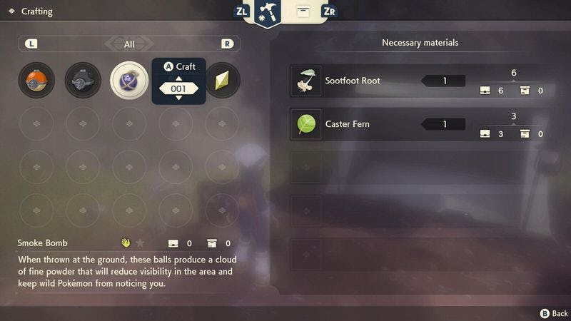 Pokémon Legends: Arceus includes crafting, a first for the series. Game Freak keeps it simple by only requiring two or three ingredients per recipe. Some resources can be picked up by your character in the open world. Others, like Tumblestones, which are used to craft Poké Balls, require you to throw a Pokémon at them to harvest.