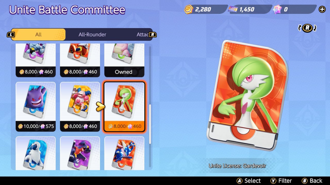 Here, you’ll see all the Pokémon in the game, including ones you might not have unlocked yet. Scroll to the right and you’ll find Gardevoir. Click on the ‘mon, and you’ll be taken to a Unite Battle Committee screen.