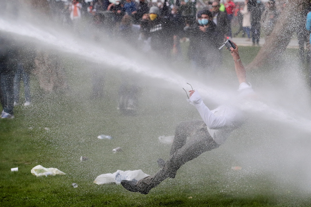 Police fired water cannon and tear gas in a Brussels park on Saturday to break up an anti-lockdown party of several hundred people designed to defy coronavirus social distancing rules.