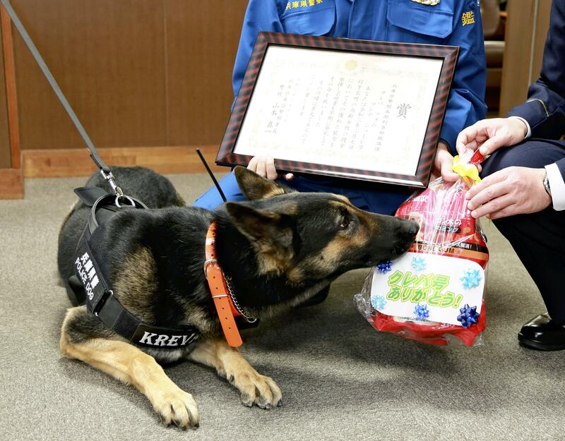 Kreva returned to the field after about 3 months away, and he was subsequently part of the Feb. 7 search for a woman in her 80s. After being given her scent, he tracked her down on a street in Chuo Ward, Kobe, in just 45 minutes. The woman was unharmed.