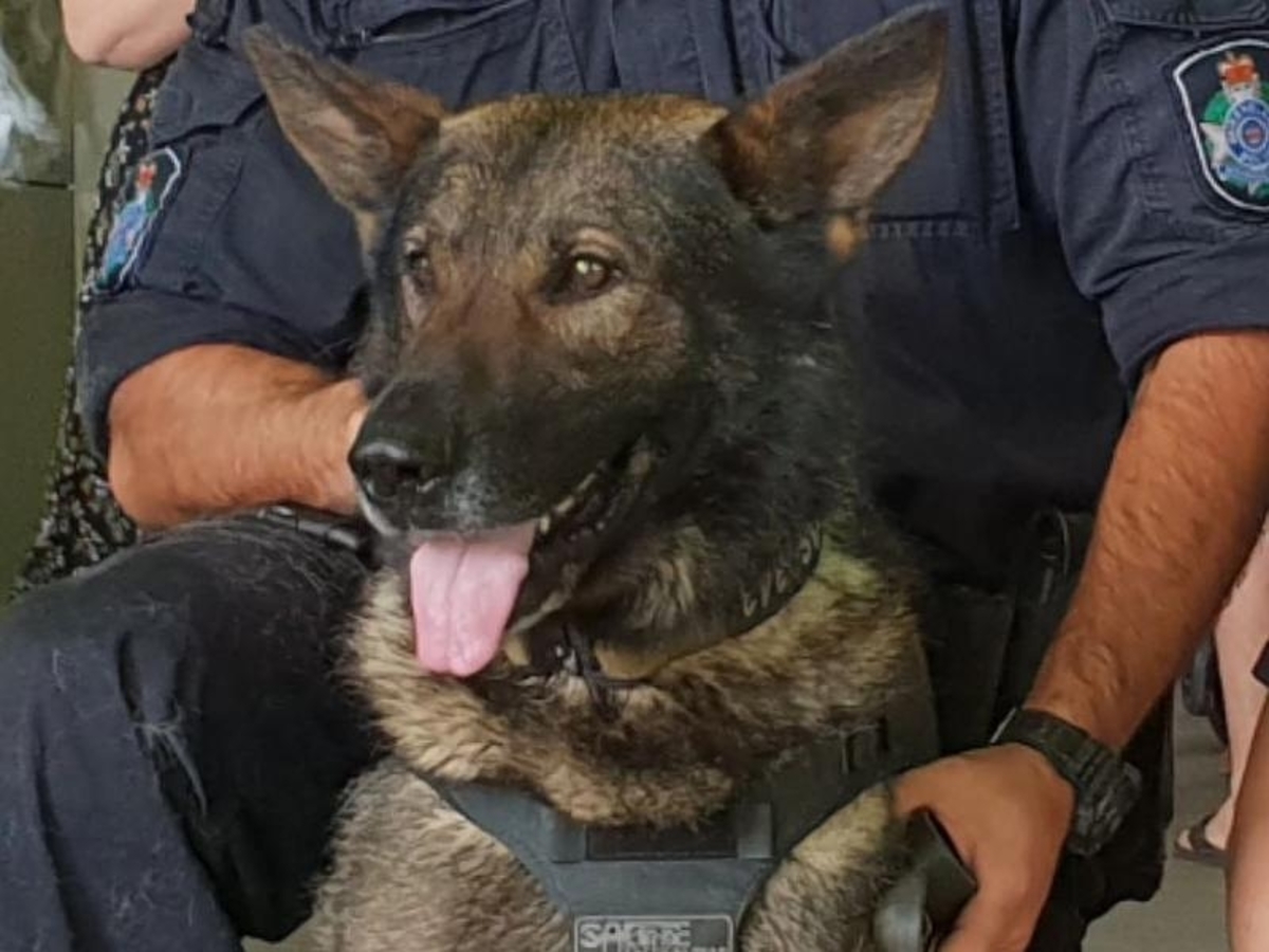 The dog was stabbed in the chest and almost died after chasing down two men who fled from a stolen ute in Brisbane. His handler performed first aid and got Kaos to an emergency vet who saved his life.